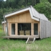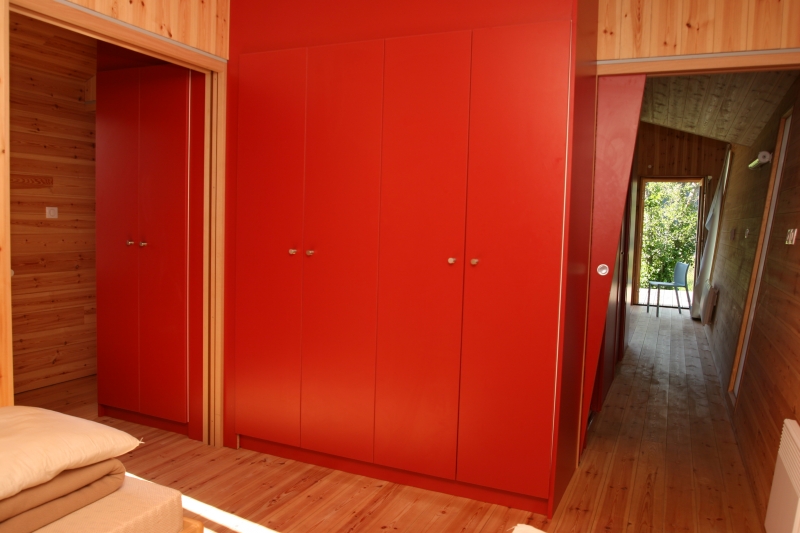 - Matériaux : structure poteaux en poutres en Douglas, panneaux en ossature bois, finition intérieure mur, sol et plafond: pin, planches bouvetées recouverte à l'extérieur par une membrane PVC thermosoudée – isolant laine minérale : mur (140mm) et plafond (180 mm) – cloisons en sapin douglas – parquet massif en sapin douglas – bardeaux de section triangulaire en mélèze naturel.